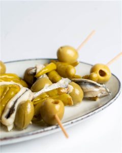 Las guildas son guindillas, aceitunas y anchoas ensartadas en un pincho, con un toque de vinagre y aceite de oliva.