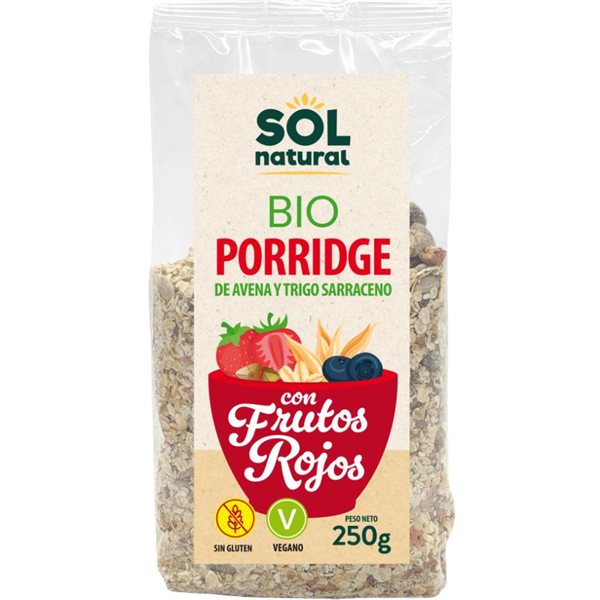 Organic Gluten-Free Red Berry Porridge with Oats and Buckwheat 250g. A nutritious and comforting breakfast designed for those looking to start the day with energy, flavor, and well-being. Made from organic oats and buckwheat, it provides a natural source of fiber, plant protein, and essential nutrients.