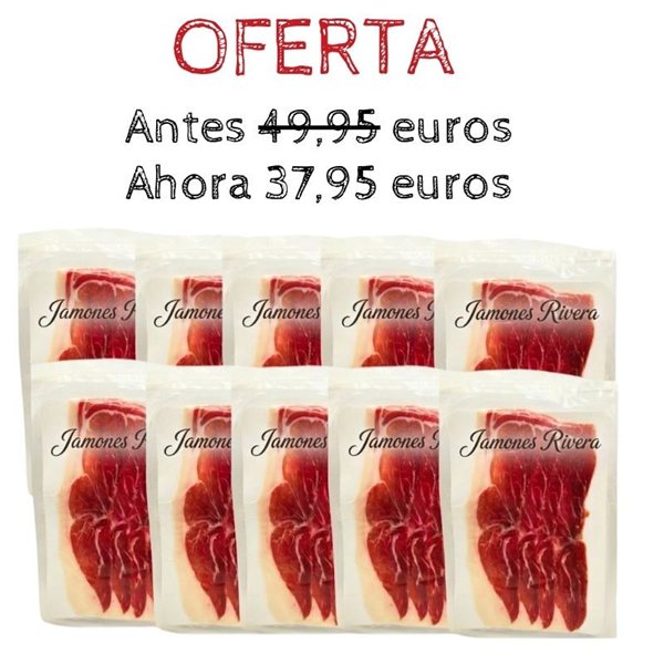 Rivera Pack with Duroc Shoulder with 10 packs of 80g cut by machine and vacuum packed, with a minimum curing of about 16 months in a natural drying facility, finishing its curing in the southern Sierra of Andalusia.