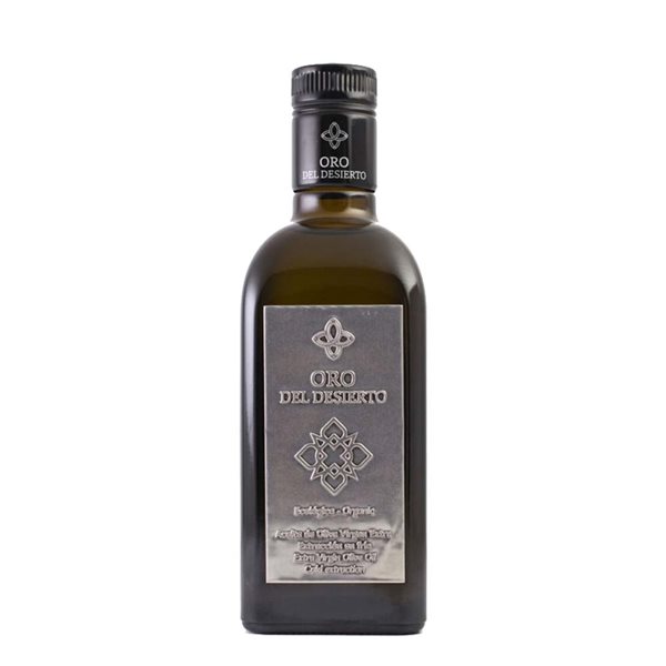 Oro del Desierto Picual 500ml is an organic extra virgin olive oil of limited production, made exclusively with Picual olives harvested at early veraison on the "El Vicario" estate, located in the Desierto de Tabernas (Almería). The olive groves are between 15 and 30 years old, planted in 7 x 5 m frames, with deficit drip irrigation and thicker clay soils with abundant stones in the central area.