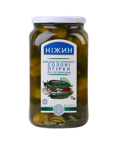 The "Po Selyanski" pickled cucumbers from the Nizhin brand are traditional-style pickles available in 920g jars. They are typical products of Slavic cuisine.
