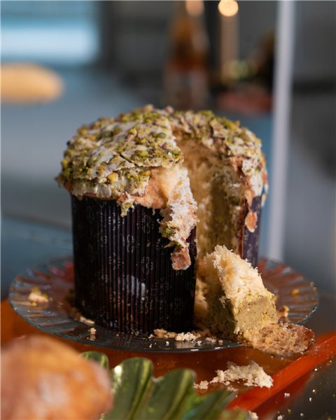 Made with natural ingredients and following the original recipe: with sourdough starter, enhanced with pistachio cream and topped with white chocolate and pieces of roasted pistachio.