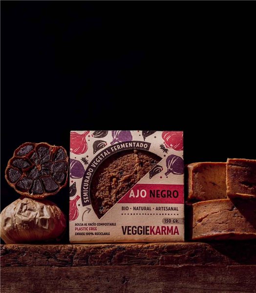 The semi-cured plant-based cheese with black garlic from Veggie Karma is their latest creation and a true gem of the new generation of fermented foods. This vegan semi-cured cheese combines lupins and cashews with the sweet and umami touch of Spanish black garlic. Its balanced and slightly sweet flavor makes it perfect for appetizers or as a topping on warm toasts. It is nutritious, light, and rich in fiber, suitable for vegetarians, vegans, and those with celiac disease. A healthy Mediterranean experience that will impress your guests from the very first bite.
