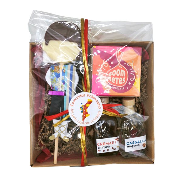 It includes a chocolate lollipop of a Fallas figure in regional costume, chocolate bombs, cremaet liqueur, and cazalla liqueur, made by artisans from the Valencian Community.