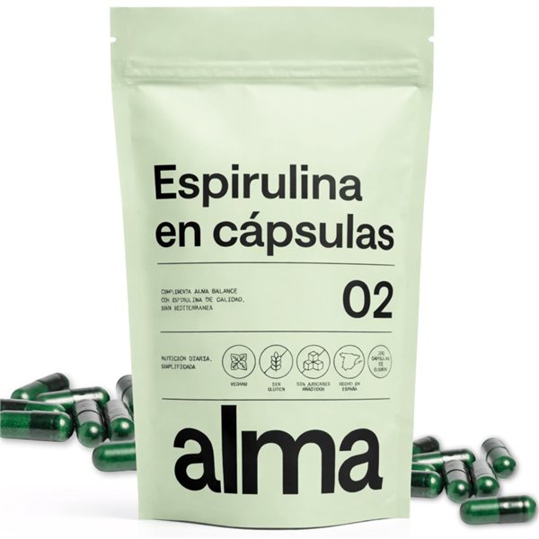 Espirulina en cápsulas ALMA es una forma práctica de incorporar espirulina a tu rutina diaria, sin el sabor característico del alga y con un formato fácil de llevar.Según recomendación habitual (4 cápsulas de spirulina/día). Se puede tomar en una sola toma o repartida.La espirulina es un superalimento natural reconocido por su alta densidad nutricional, ideal como apoyo diario para sentirte con más vitalidad y cuidar tu rutina.