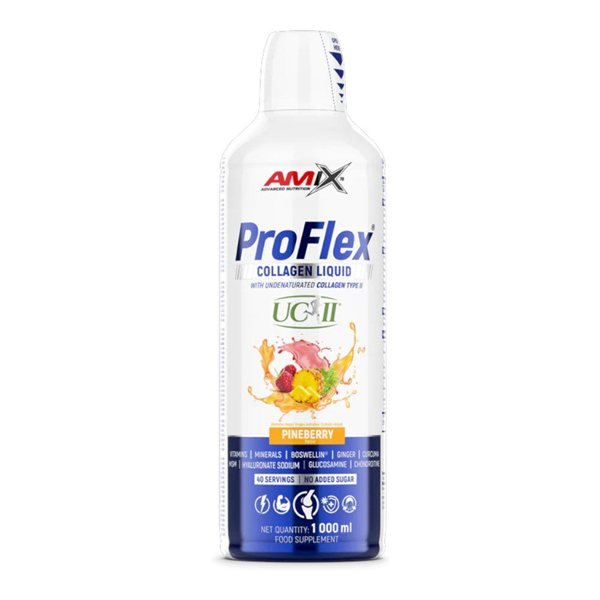 Amix™ ProFlex® Collagen Liquid es un complemento alimenticio líquido con edulcorantes para preparar una bebida. Combina hidrolizado de colágeno y UC-II® (colágeno tipo II no desnaturalizado), junto con sulfato de glucosamina, MSM, sulfato de condroitina, hialuronato sódico y glicina; además incluye un complejo de vitaminas, minerales y extractos vegetales/enzimas.