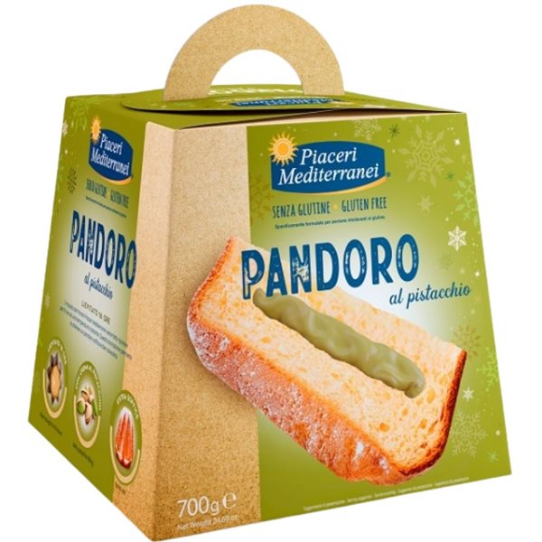 Pandoro con Crema de Pistacho Sin Gluten 700g Piaceri Mediterranei.Sin aceite de palma y con abundante pistacho en su interior. Receta original con16 horas de fermentacióne ingredientes selectos. Al mismo tiempo, preparado conmasa madrey con un rico relleno.