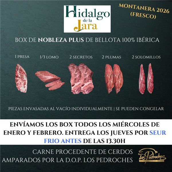 Carne de bellota 100% ibérico. Sin conservantes ni aditivos. Producto fresco y envasado al vacío. Consumir preferentemente antes de 7 días desde su fecha de envasado. Se puede congelar. Envío refrigerado con entrega en menos de 24h. Días de envío de los pedidos: Todos los MIÉRCOLES de la Montanera de 2024 > Entregas los jueves.
