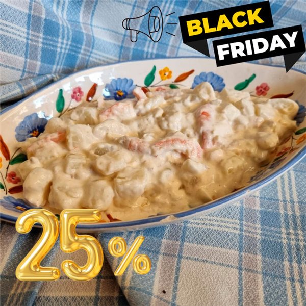 patata 44%, mayonesa (SOJA, HUEVO) 27%, agua de cocción 10%, GAMBA 8%, HUEVO cocido 7%, ATÚN (ATÚN, aceite de girasol) 4%, sal 0,11%.