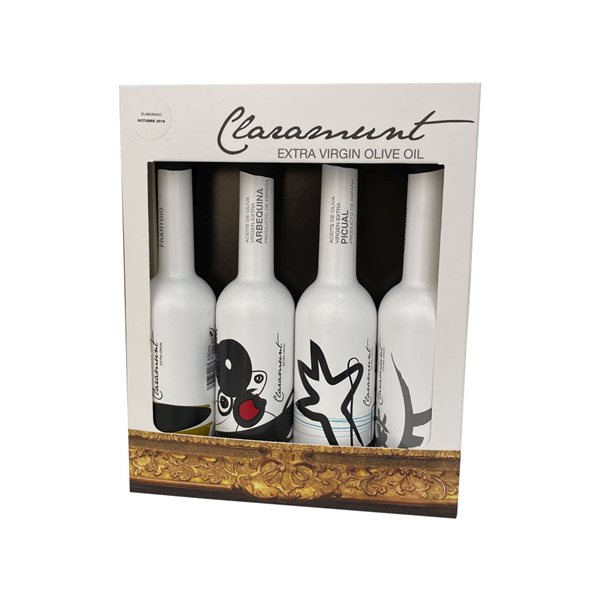 Pack degustación con cuatro variedades monovarietales premium, cada una en botella de 100 ml.