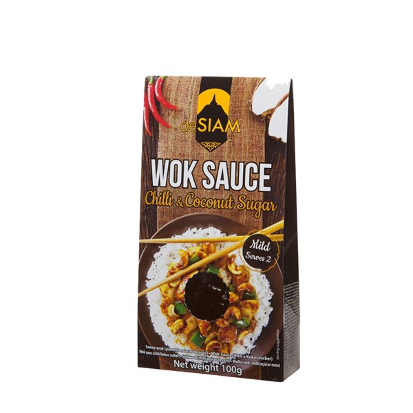 La Salsa Wok Chilli & Azúcar de Coco 100g Desiam es una salsa inspirada en la cocina asiática, especialmente diseñada para añadir sabor y un toque picante a platos como salteados, fideos, wok, carnes a la parrilla, o incluso como acompañamiento para mojar. La combinación de chili (chile) y azúcar de coco le da un perfil único, equilibrando lo picante con un toque dulce y tropical.