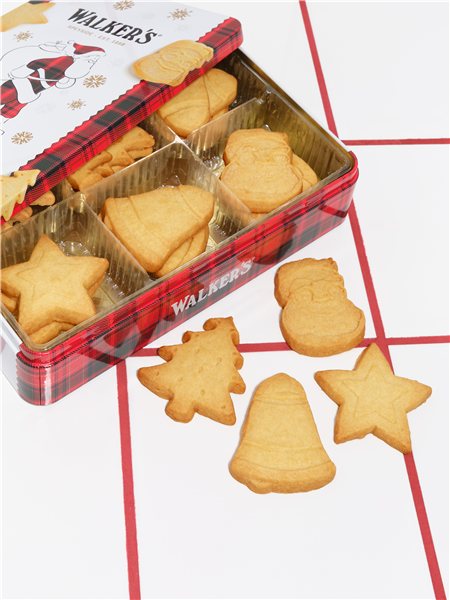 Lata festiva de shortbread con diseño de Santa Claus , de la firma Walker’s Shortbread. Contiene galletas clásicas de mantequilla (“all-butter shortbread”) con formas navideñas, ideales para regalar o disfrutar durante la temporada de fiestas.