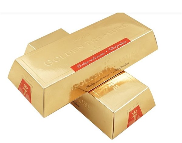 Cajita llena de bombones con forma de lingote de resplandeciente color oro.