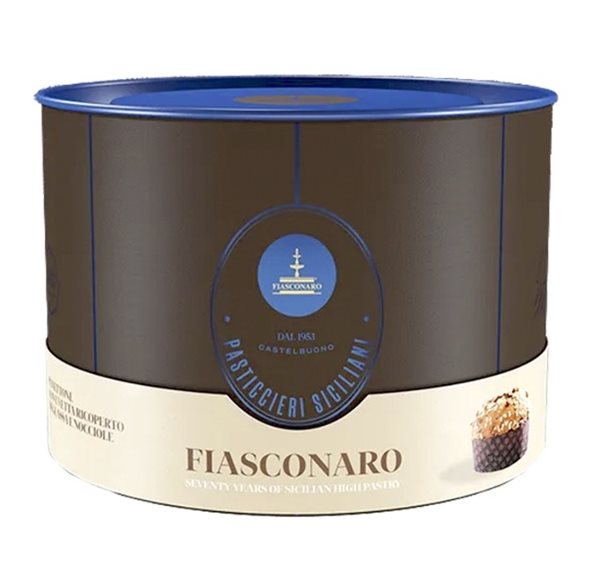 Panettone con pasas cubierto de glaseado y avellanas elaborado de la manera tradicional.