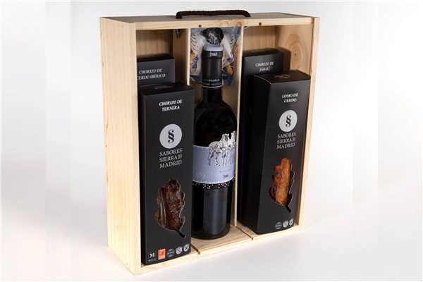 Lomo embuchado de cerdo, chorizo de cerdo ibérico, chorizo de jabalí, chorizo de ternera I.G.P. Sierra de Guadarrama, picos camperos, vino «Dos de mayo»