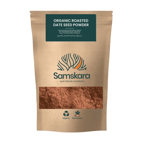 ALTERNATIVA NATURAL AL CAFÉ El polvo de semillas de dátiles tostadas Samskara es un sustituto saludable y sin cafeína del café, con un rico aroma tostado y un suave sabor terroso