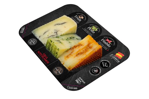 Tabla con cuñas de queso elaborado con leche de pasturizada de oveja en formato de 100g Trufa Negra, 100g de Pesto y 100g de Diablo