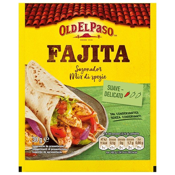 El sazonador para fajitas Old El Paso contiene una mezcla equilibrada de especias como pimentón, ajo y comino, pensadas para realzar el sabor del pollo o la carne de res en tus fajitas. Solo añade la mezcla al salteado y disfruta de un plato delicioso y fácil de preparar.
