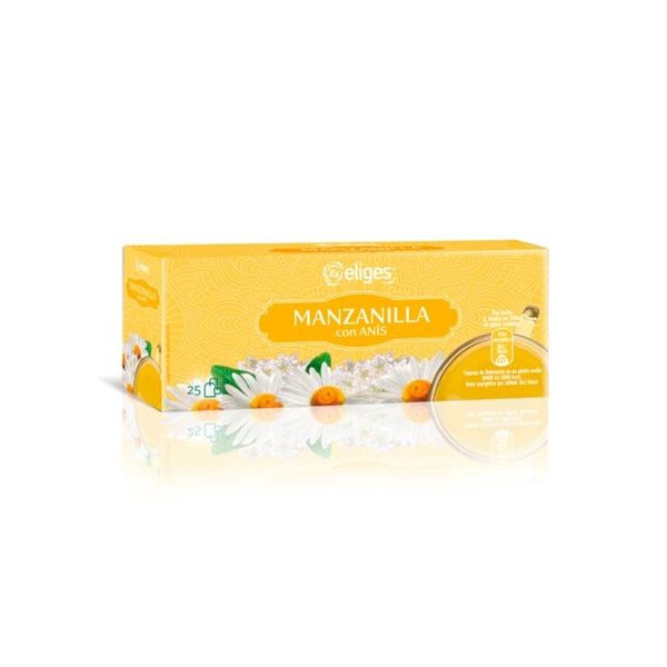 Té de manzanilla con anís Eliges 25 bolsitas, infusión digestiva y reconfortante con sabor suave.