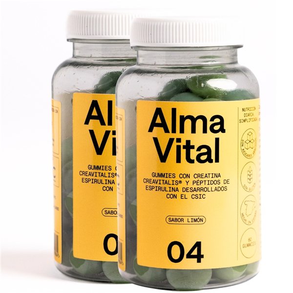 Gummies de Créatine Creavitalis®, Vitamine D3 et Spiruline Hydrolysée | Alma Vital Gummies sont sans sucre, avec de la créatine à 99,9 % de pureté, véganes et au goût de citron.