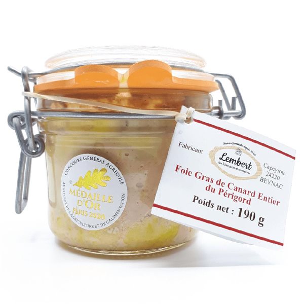 Ingrédients : foie gras de canard, sel, poivre noir, vin de MonbazillacLa Maison Lembert : depuis 4 générations et les années 40, "qualité", "tradition" et "terroir" sont les mots clefs de cette conserverie artisanale du Périgord noir. Multi médaillée, notamment au Concours Général Agricole de Paris, la Maison Lembert adhère àl'association Foie Gras du Périgord, ce qui garantit l'origine, la qualité et le contrôle sur les produits.