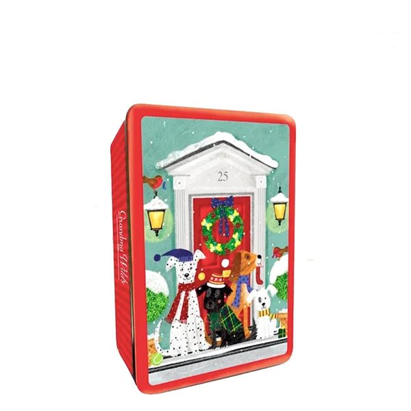 Une belle boîte décorée d'une charmante scène de Noël, avec une série de chiens attendant avec enthousiasme devant une porte enneigée. À l'intérieur, la boîte offre une délicieuse sélection de bonbons, y compris des biscuits au gingembre et au citron savoureux et des biscuits au beurre riches et délicieux avec des pépites de chocolat et de la crème. Cette combinaison festive de délicieux biscuits et d'illustrations originales en fait le cadeau idéal ou un plaisir pour vous pendant les fêtes.