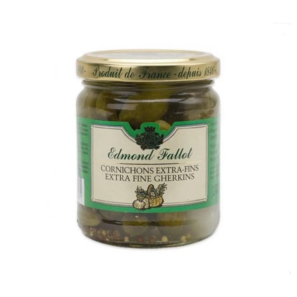 Les cornichons au vinaigre d'Edmond Fallot sont des cornichons extra fins de qualité supérieure. Des cornichons marinés élaborés avec des cornichons, du vinaigre de vin, des petites échalotes, de l'estragon, des grains de coriandre et de la moutarde, du sel et des arômes naturels. Les cornichons au vinaigre sont un condiment couramment utilisé comme garniture ou comme ingrédient dans diverses recettes telles que des hamburgers, des salades, des sandwichs et des snacks. La qualité des cornichons Edmond Fallot en fait des cornichons gourmet.