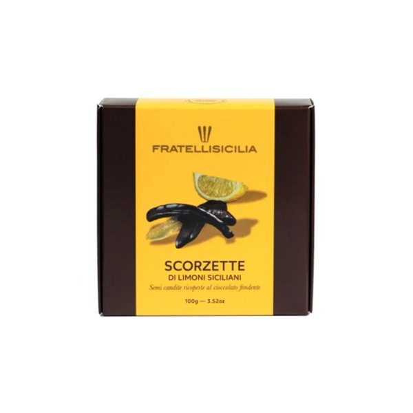 Les Écorces de Citron de Sicile Enrobées de Chocolat Noir de Fratelli Sicilia sont une délicieuse friandise gourmet qui combine la fraîcheur du citron sicilien avec l'intense saveur du chocolat noir.