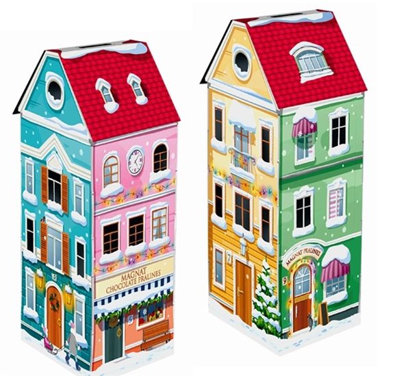Boîte de Noël remplie de bonbons à l'orange enrobés de chocolat Reutilisez-la pour décorer votre salon. De plus, elle a une fente sur le dessus et peut nous servir de tirelire. La maison a un côté de chaque couleur, comme le montre la photo. Présentation : boîte en métal Quantité : 100g Marque : Magnat