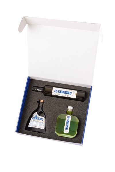 Estuche mit unseren drei emblematischsten AOVE-Flaschen.