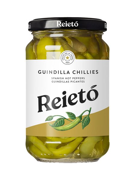 Die scharfen Peperoni von Reietó sind ein Klassiker unter den würzigen Snacks. Sie präsentieren sich in einem leuchtend gelbgrünen Farbton und haben eine langgestreckte, elegante Form, die zum Bissen einlädt. In der Nase sticht das stechende Aroma des hochwertigen Essigs hervor, der sie konserviert, zusammen mit einem herb-frischen Hintergrund. Beim Probieren ist ihre Textur fest und knusprig, sie explodieren auf dem Gaumen mit einer klaren Säure, die schnell einem lebhaften und anhaltenden, aber ausgewogenen Schärfe weicht. Es handelt sich nicht um eine Schärfe, die den Geschmack überlagert, sondern ihn verstärkt, was diese Peperoni (oder "bitxos") zur perfekten Ergänzung macht, um den Gaumen zwischen fettigen Bissen zu reinigen oder um jeder kreativen Gilda Leben einzuhauchen.