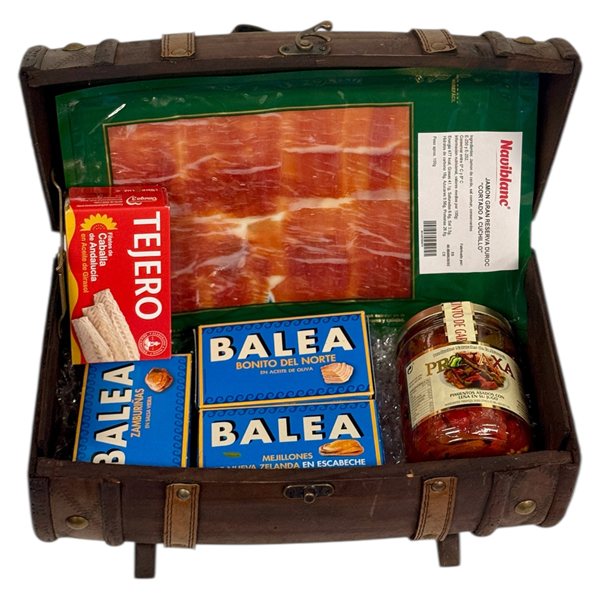 Gourmet-Paket, präsentiert in einer eleganten Holztruhe, gedacht, um vom ersten Moment an zu überraschen. Es enthält eine sorgfältige Auswahl von Produkten aus dem Meer und vom Land: handgeschnittener Gran Reserva-Schinken, Premium-Konserven von Muscheln, Makrelen, Zamburiñas und Bonito del Norte, sowie traditionelle geröstete Paprika. Eine vollständige und ausgewogene Kombination, ideal zum Verschenken oder um ein vielfältiges und besonderes Gourmet-Erlebnis zu genießen.